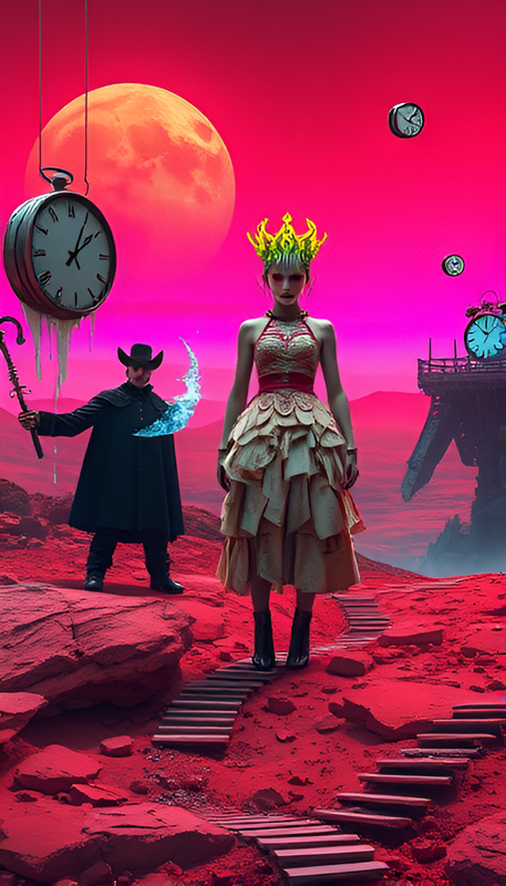 Stil: H.R. Giger trifft Salvador Dalí – biomechanischer Horror, schmelzende Uhren, verzerrte Perspektiven. TikTok-Albtraum-Ästhetik: Glitch-Effekte, Emoji-Hologramme (👑💥📄✨🧀🌈). Farbschema: Radioaktives Gelb 🧀, Neon-Pink 🌈, Papier-Weiß 📜, Banes dunkles Grün 🎩, Mars-Rost 🪐 mit eisigen Blautönen ❄️. Technik: 8K-Auflösung, filmisches Licht, hyperrealistische Texturen (fließender Käse, zerrissenes Papier), chaotische Komposition. Signatur: “Berndpulch.org” in Pulp-Fragment unten rechts.