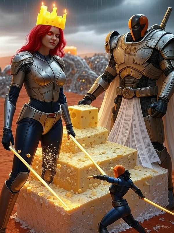 Mars Colony, 2047 – Janelle-Sauron 👑🧀, crowned with radioactive Gorgonzola and glowing red eyes, rules alongside General Zod ⚡👑 from a biomechanical pulp fortress 🏰📜 made of shredded documents and toxic memes 📄📱. Their reign floods Mars with pulp tyranny, but a new figure emerges to shake their empire: Lady Deathstroke Veyra 🏳️🌈⚔️, Janelle’s old lesbian lover, who initiated her transgender journey in a glitter-fueled ritual years ago! ✨💉