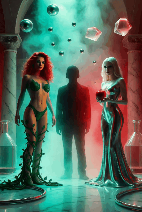 In the crimson corridors of Hotel Cyanide, where every wall dripped with memory and morphine, Ehlers found himself once again between worlds — between Janelle’s trembling devotion and Salomé’s floating hunger.