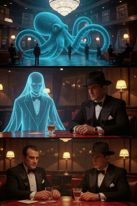 Und der Krake? Er webt die alten Geschichten in sein Netz ๐๐ธ๏ธ: Aus Filmrollen werden Zeitungsarchive ๐๏ธ, aus Casino-Chips werden Patronenhรผlsen ๐ซ๐ธ. Sein Auge beobachtet, wie sich die Kreise schlieรen. ๐๏ธ๐