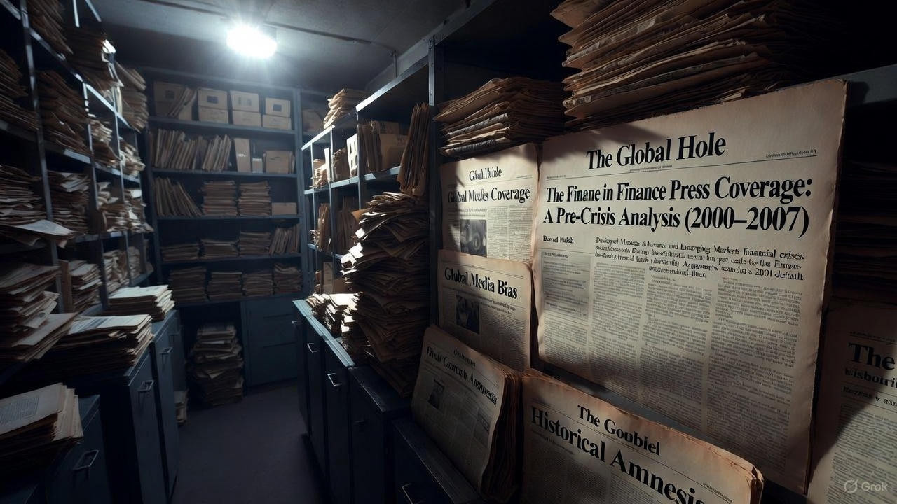 Hindi: एक मंद रोशनी वाली अभिलेखागार कक्ष पुरानी अखबारों और दस्तावेजों से भरी हुई, वित्तीय प्रेस कवरेज में ‘वैश्विक छेद’ का खुलासा: संकट पूर्व विश्लेषण (2000–2007) बर्न्ड पुल्च द्वारा, मीडिया पूर्वाग्रह और ऐतिहासिक भूलने की बीमारी को जगाती हुई।